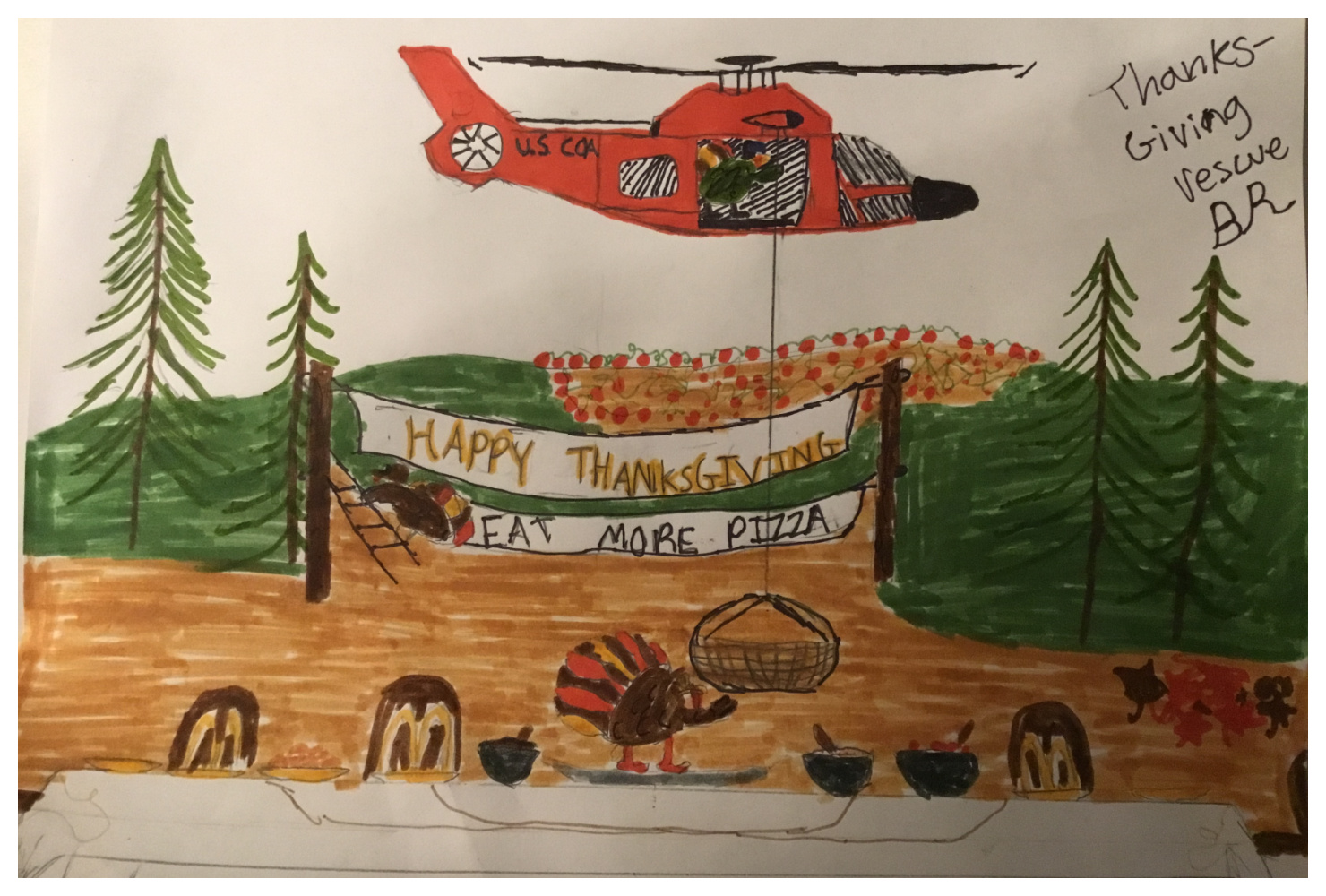 “Thanksgiving Rescue” by Braxton, age 13, child of AETCS Benjamin Rosen, was selected as the top piece for the greeting. The drawing shows a Coast Guard helicopter dropping a rescue basket to pick up a turkey from the Thanksgiving table, under a banner that reads “Eat More Pizza.” The helicopter is piloted by a fellow turkey!
